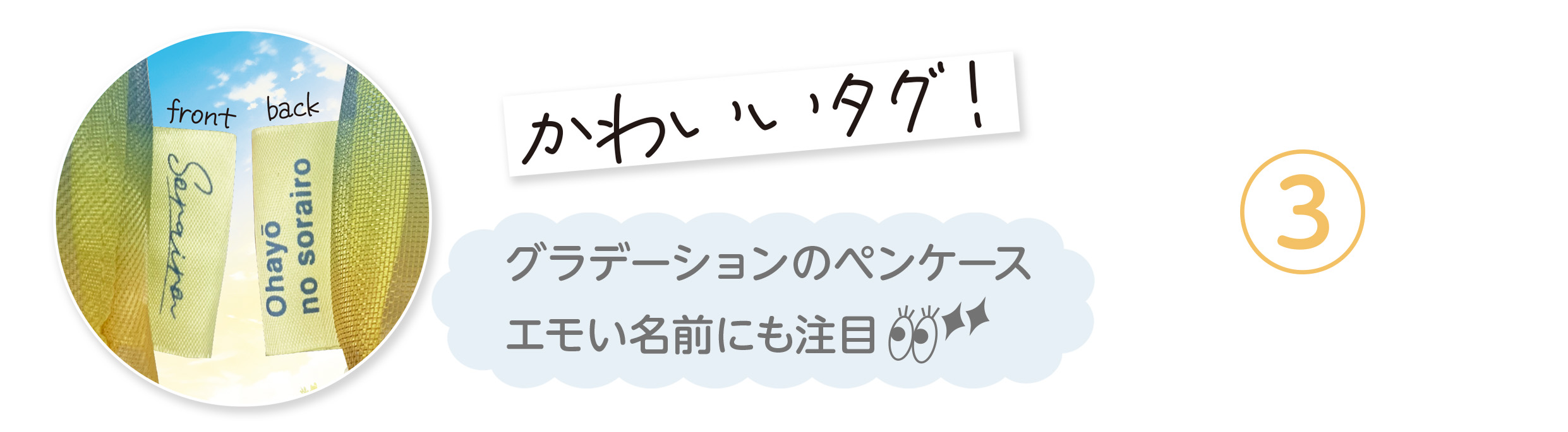 表にはそら色ロゴ、裏は色の名前が入ったかわいいタグがポイント!