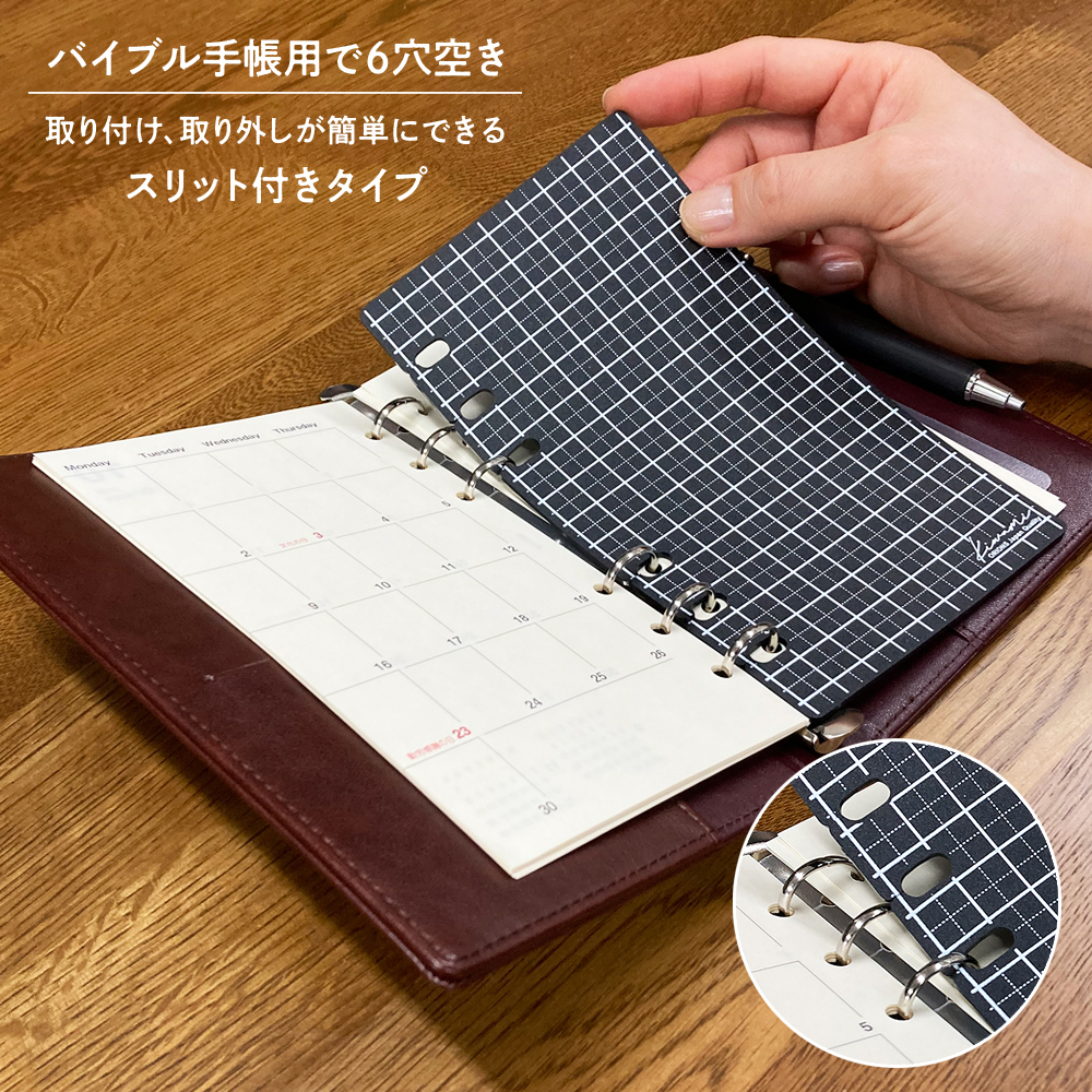 ●バイブル手帳用で6穴空き。 取り付け、取り外しが簡単にできるスリット付きタイプです。